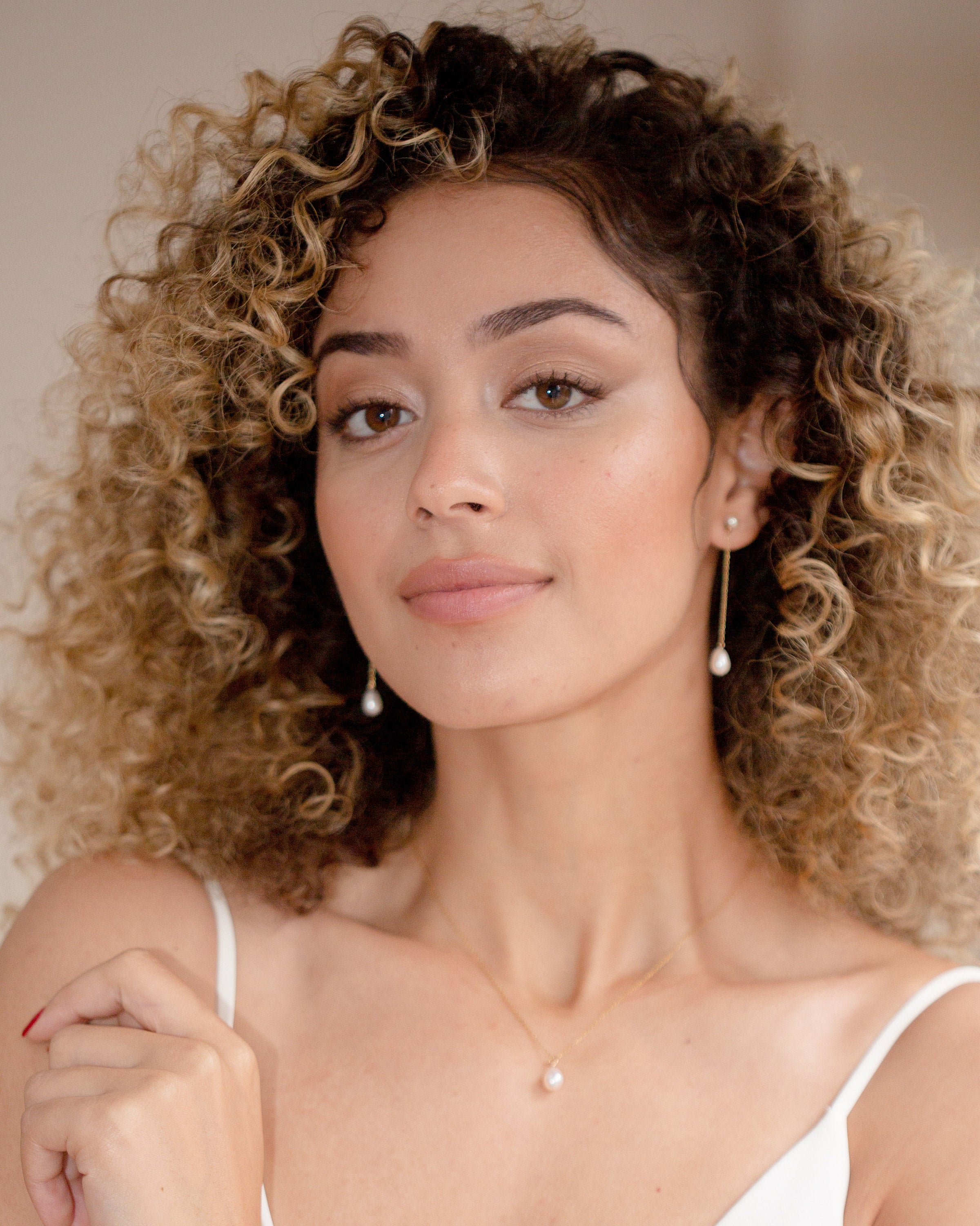 One of our best-selling jewelry sets. Pearl drop earrings, elevated. Freshwater pearls hang on a delicate chain from a lustrous pearl stud. Paired with a delicate necklace with floating freshwater pearls. Finished at the back with a dainty crystal drop.