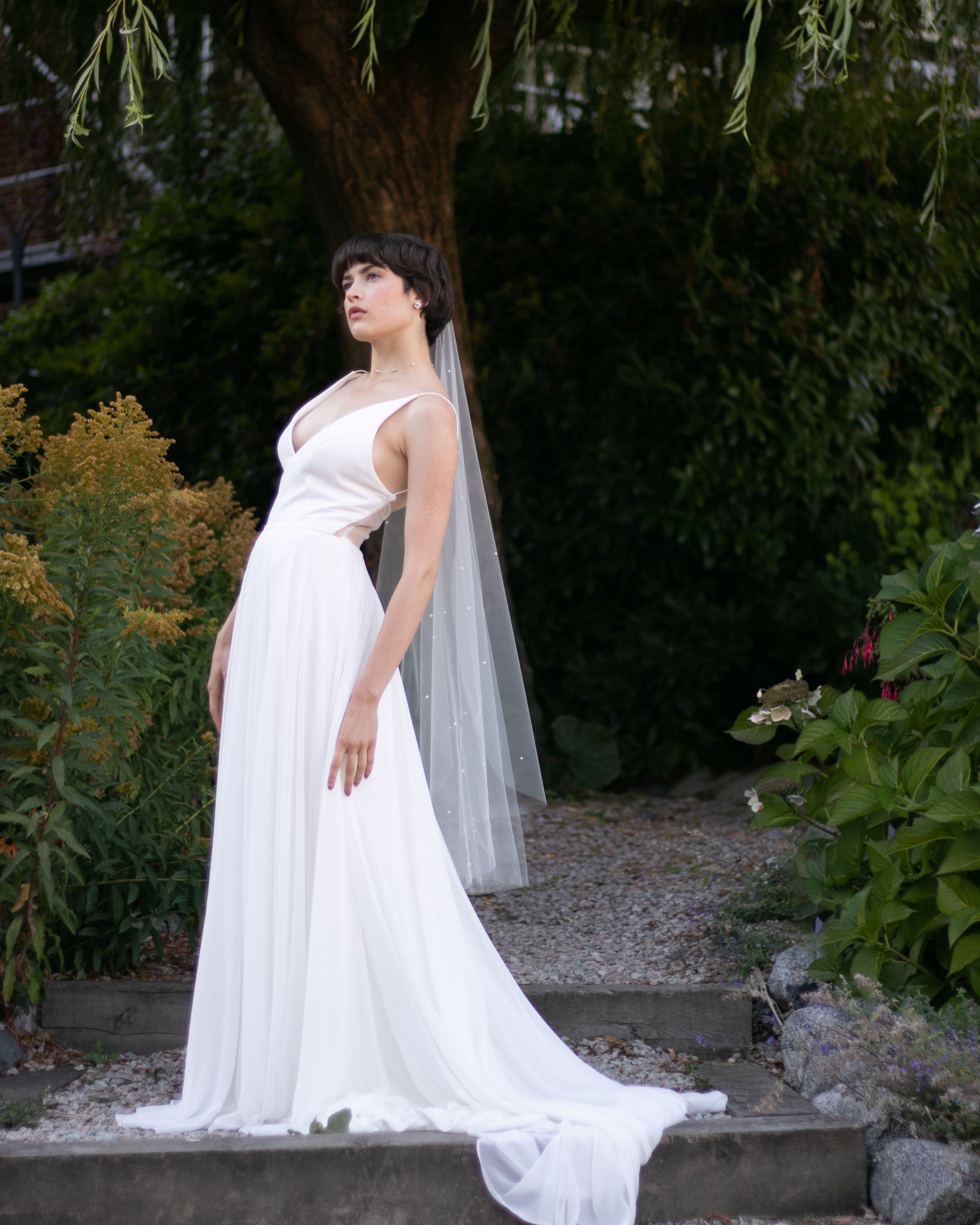 Our light-as-air Petal Veil, elevated with scattered round pearls throughout the veil. Your choice of faux or freshwater pearls are carefully placed in three sizes.